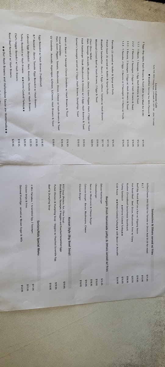 Craving classic brunch? Dive into the Cabruce Eggs Benedict (CA$20.95), featuring perfectly cooked poached eggs atop crispy hash browns, drizzled with their acclaimed hollandaise sauce. For something hearty, the Korean Style Big Bowl Soup (CA$19.95) and the P.F.F Soup (CA$19.95) are perfect choices, both packed with fresh ingredients and unique flavors.